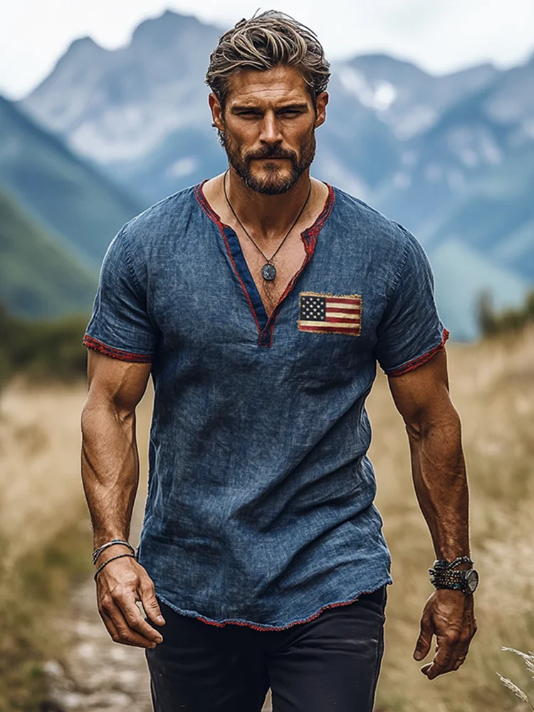 Men's Independence Day American Flag Print Linen Blend Shirt