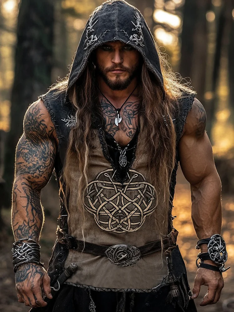 Men's Viking Celtic Knot Patchwork Art Linen Hooded Vest