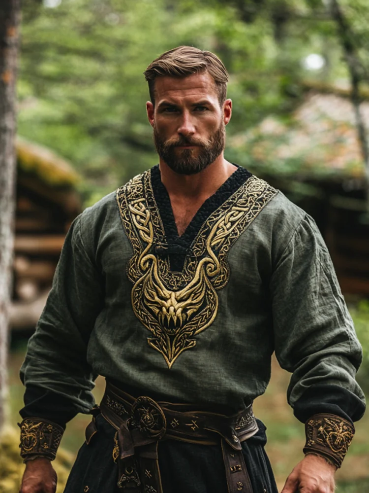 Men's Vintage Viking Dragon With Celtic Knot  Pattern Cotton And Linen Long Sleeve Shirt