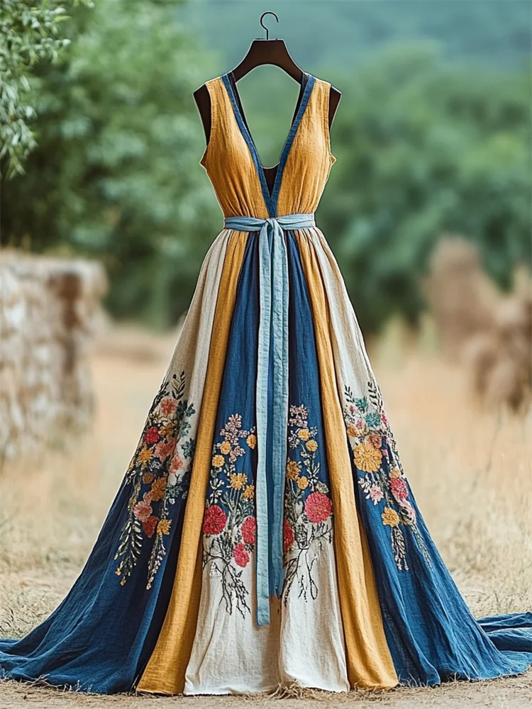 Vintage Floral Ukraine Colorblock Linen Maxi Dress