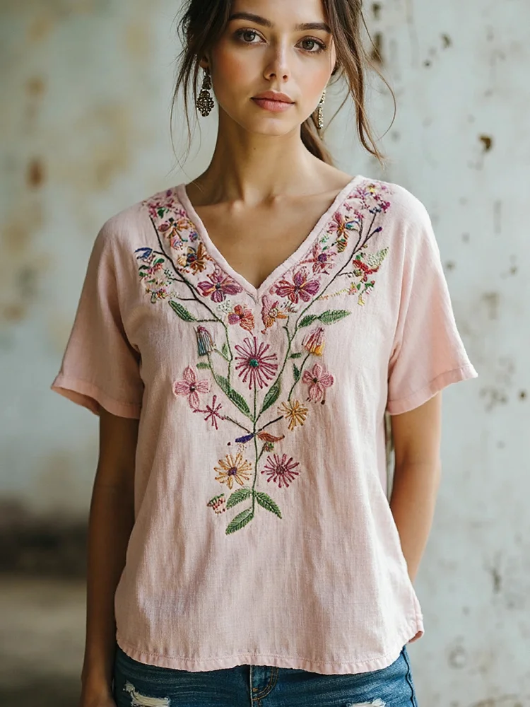 Women's Floral Embroidery Art Casual Linen Top