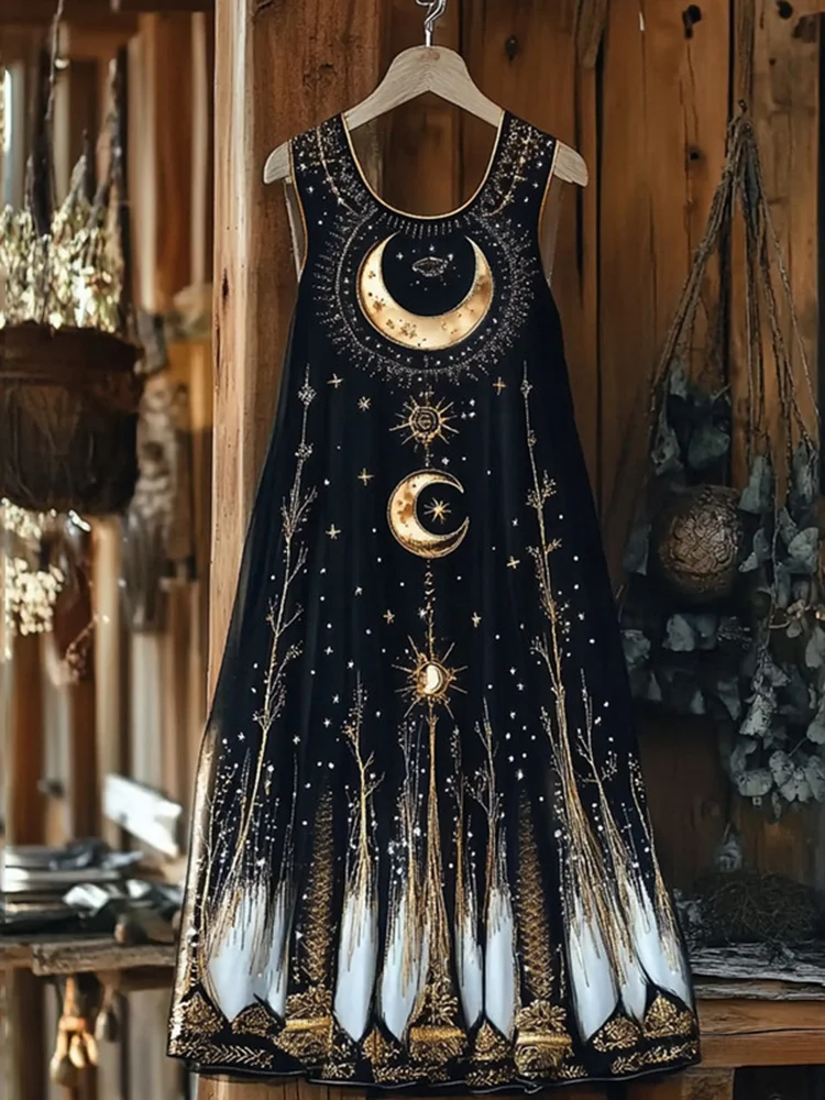 Women's Star And Moon Embroidery Pattern Art Print Cotton And Linen Dress