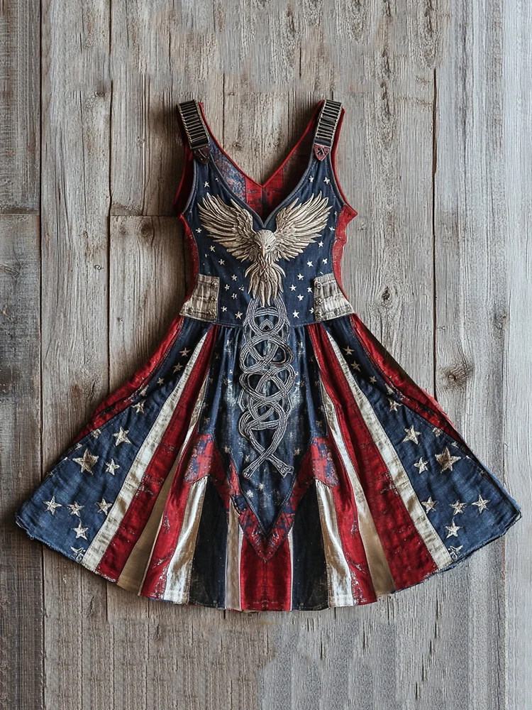 Women's Vintage Independence Day Flag Eagle Celtic Knot Embroidery Art Linen Tank Dress