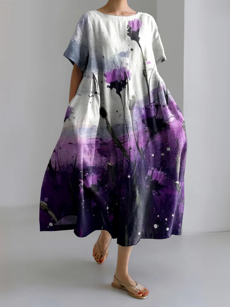 Women's Vintage Scottish Thistle Oil Painting Art Short Sleeve Dress