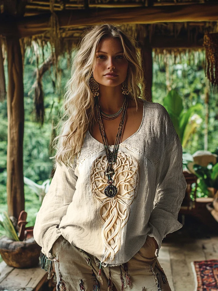 Women's Vintage U Viking Tree Of Life Art Cotton And Linen T-shirt