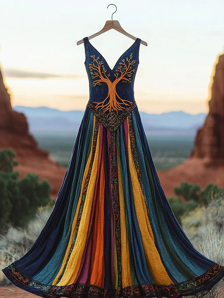 Women's Vintage Viking Tree Of Life Celtic Knot Colorful Patchwork Art Linen Vest Dress
