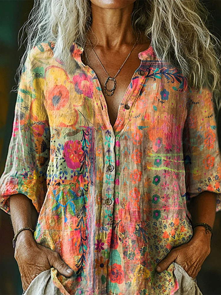 Women's Vintage Watercolor Flower Collage Art Print Casual Cotton And Linen Shirt